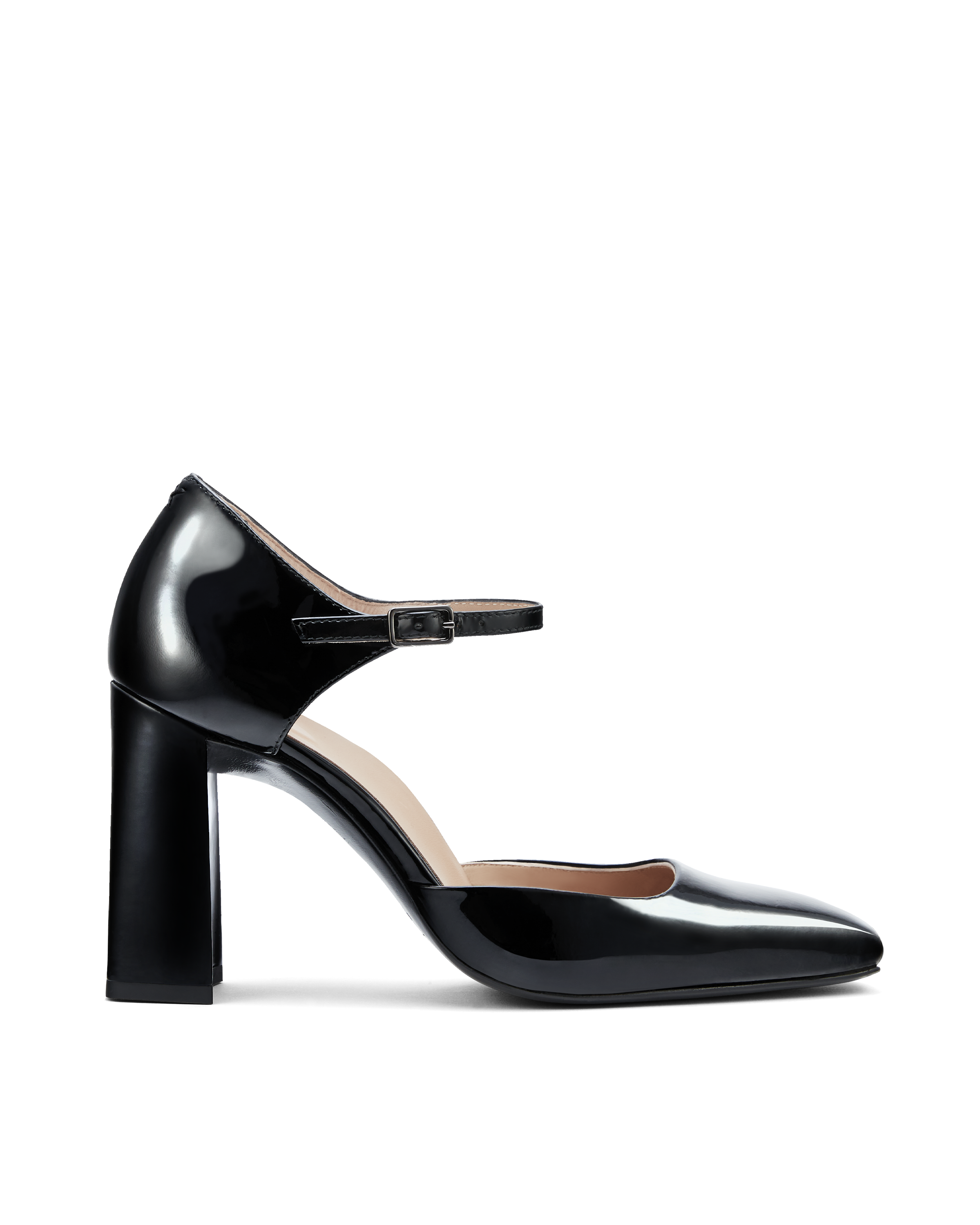 This square toe Mary Jane pump is shaped with soft, elegant angles. The striking toe shape is complemented by a block heel and squared off throat line.