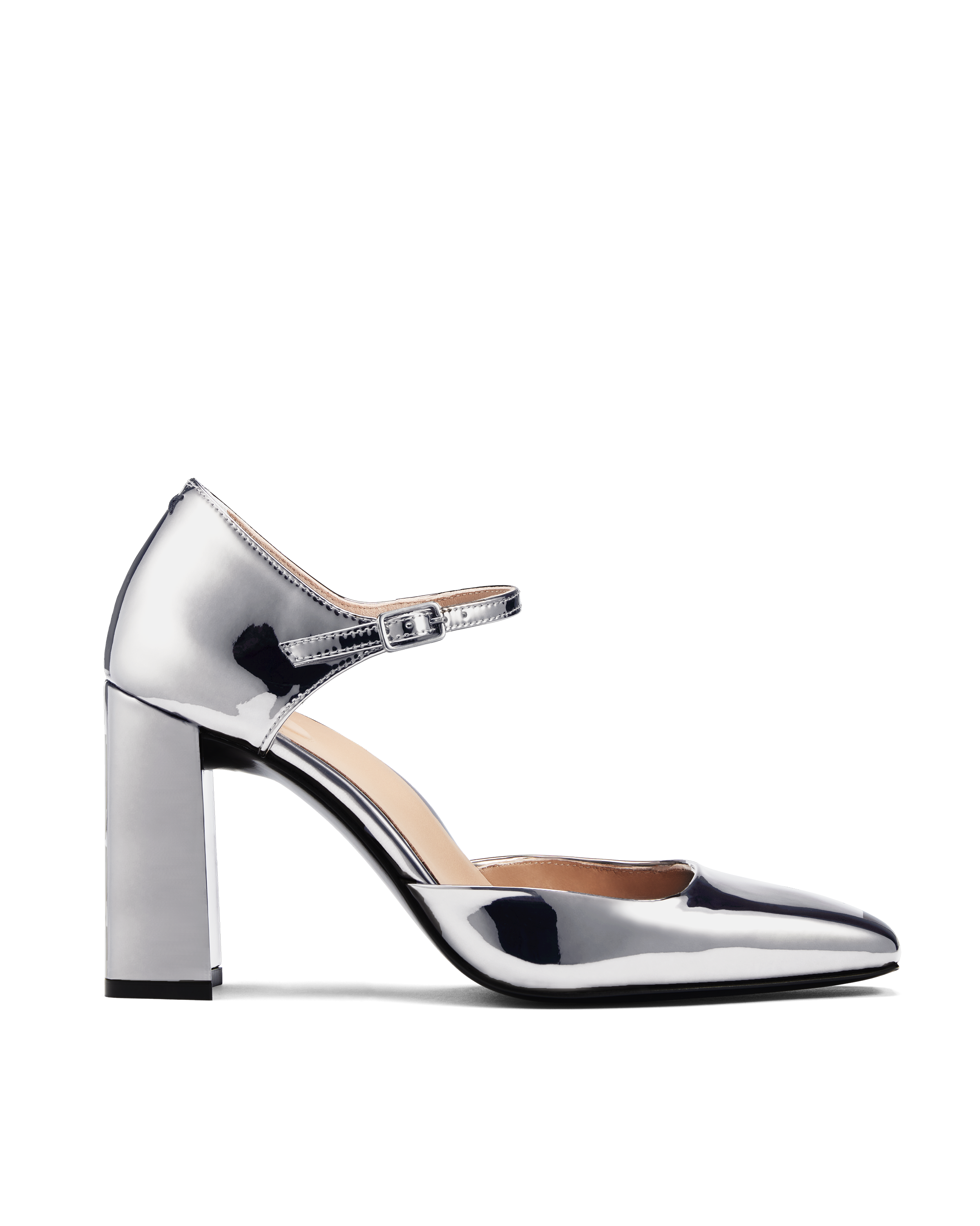 This square toe Mary Jane pump is shaped with soft, elegant angles. The striking toe shape is complemented by a block heel and squared off throat line.