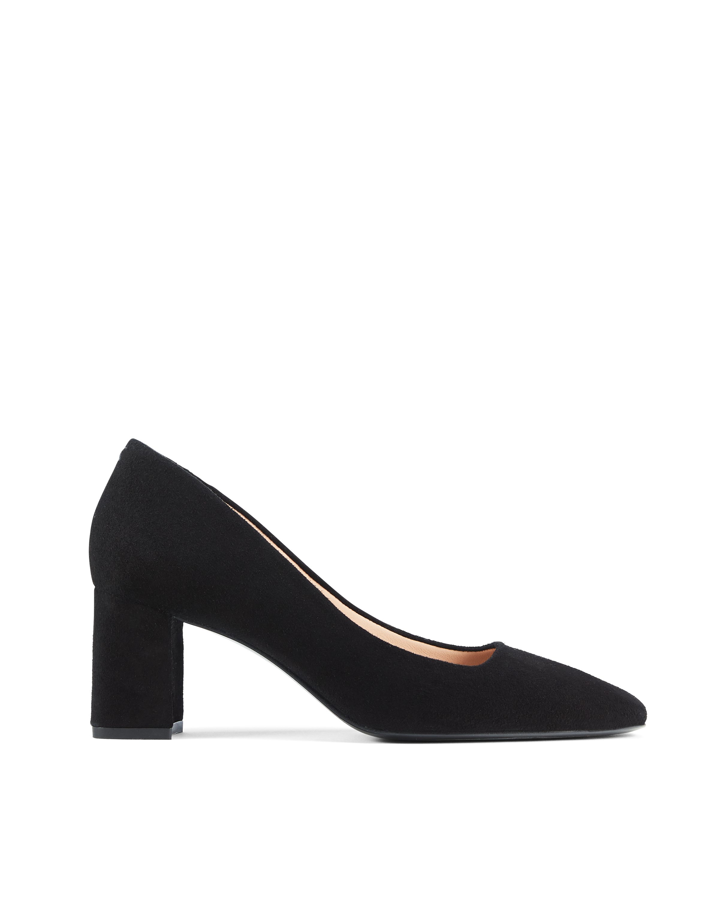 This square toe pump is shaped with soft, elegant angles. The striking toe shape is complemented by a block heel and squared off throat line.