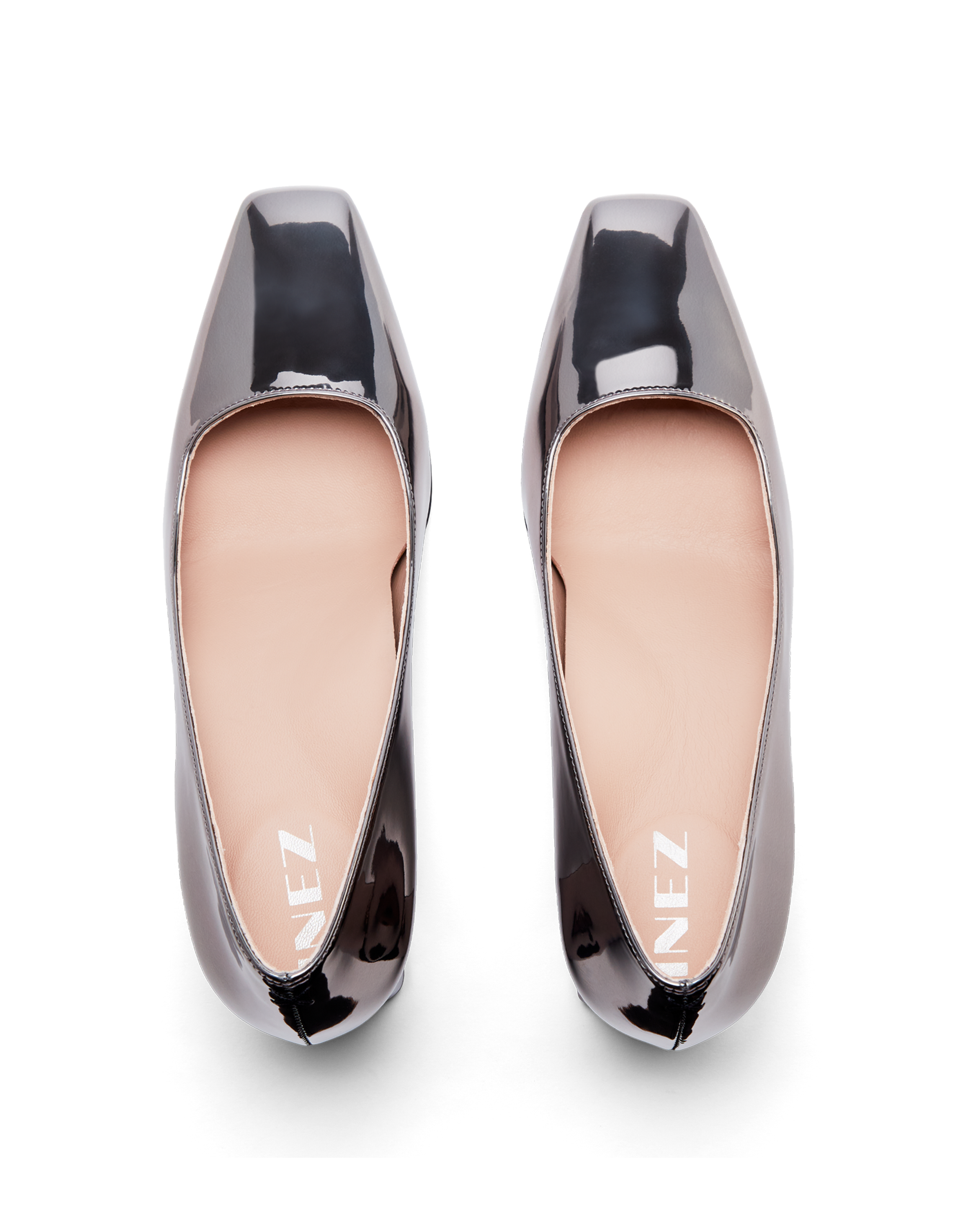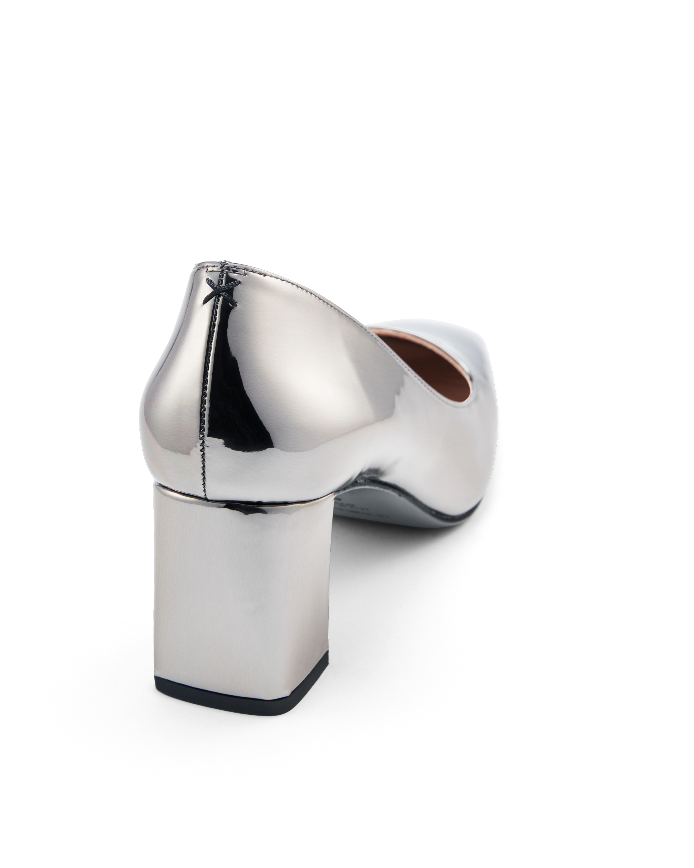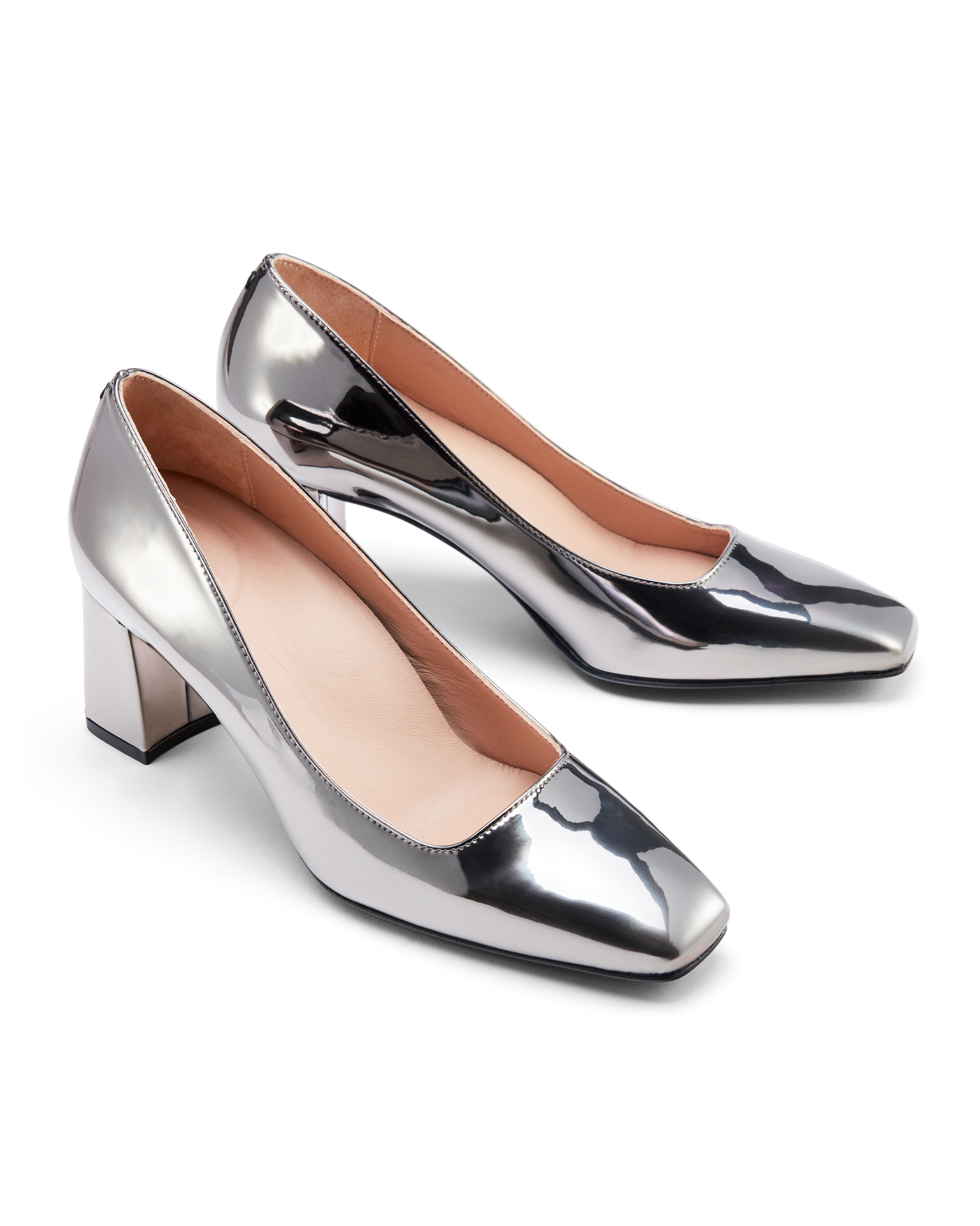 This square toe pump is shaped with soft, elegant angles. The striking toe shape is complemented by a block heel and squared off throat line.