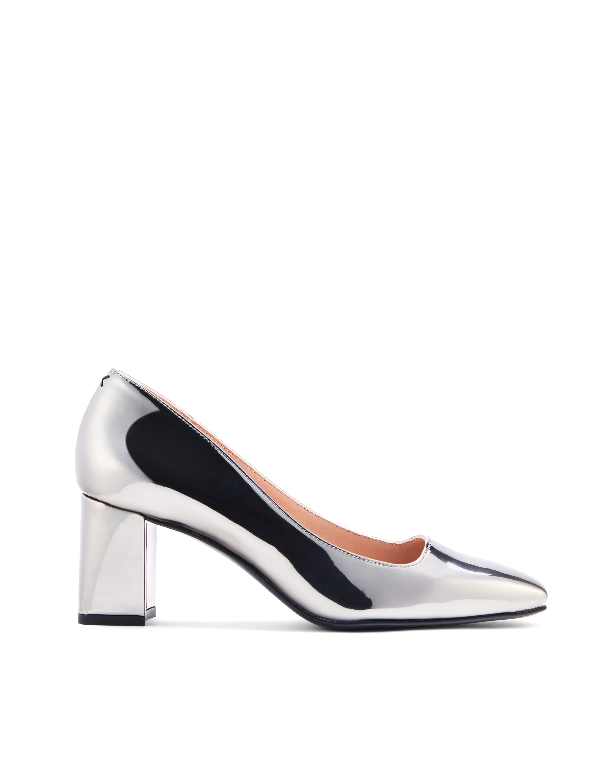 This square toe pump is shaped with soft, elegant angles. The striking toe shape is complemented by a block heel and squared off throat line.