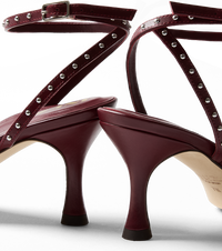 This occasion sandal reimagines the going‑out classics with a modern edge. Two airy, crossing straps offer a secure fit, while micro stud details draw the eye. The elegant almond toe and ankle wrap create a silhouette that feels both feminine and architectural. Set on a flared Louis heel and embedded with our signature cushioned insole.
