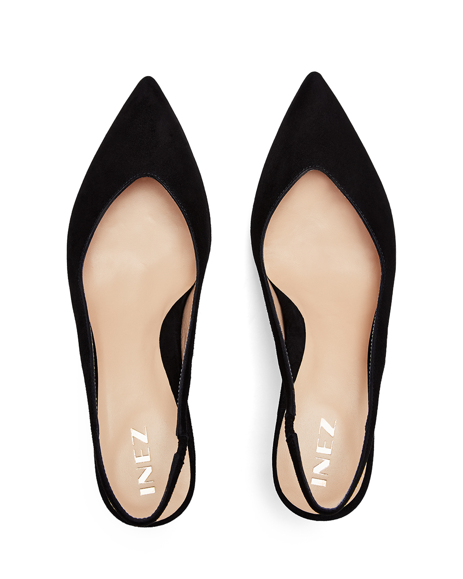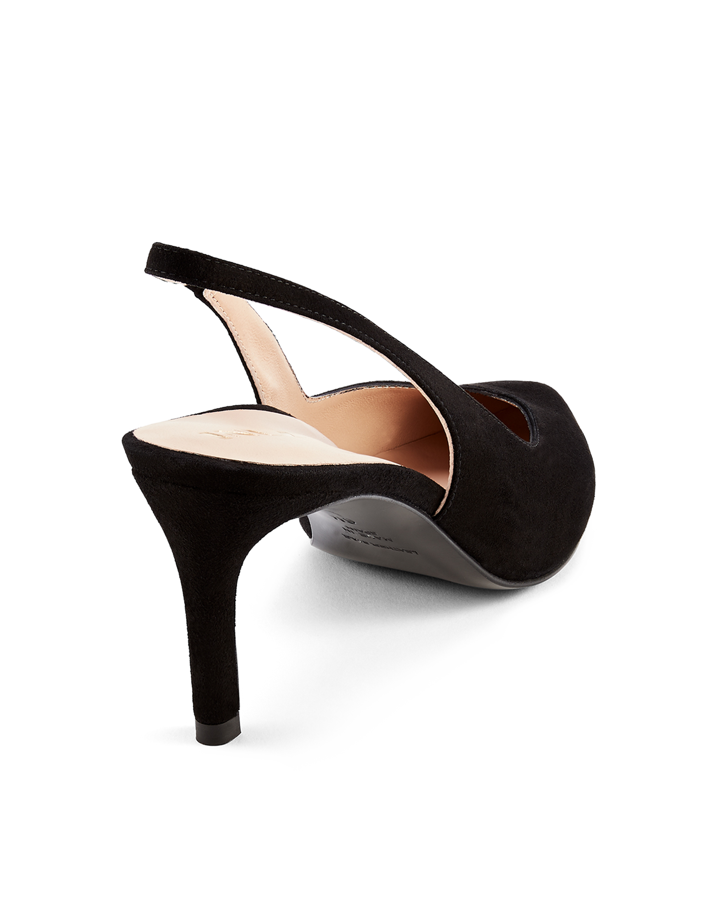 A mid‑heel slingback with a flattering V‑shape topline and classic pointed toe. A discreetly elasticized back strap provides an effortless, held‑on fit.