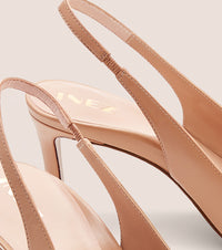 A mid‑heel slingback with a flattering V‑shape topline and classic pointed toe. A discreetly elasticized back strap provides an effortless, held‑on fit.