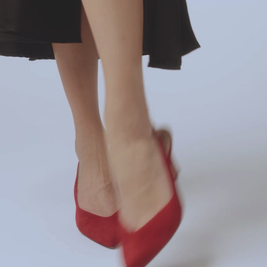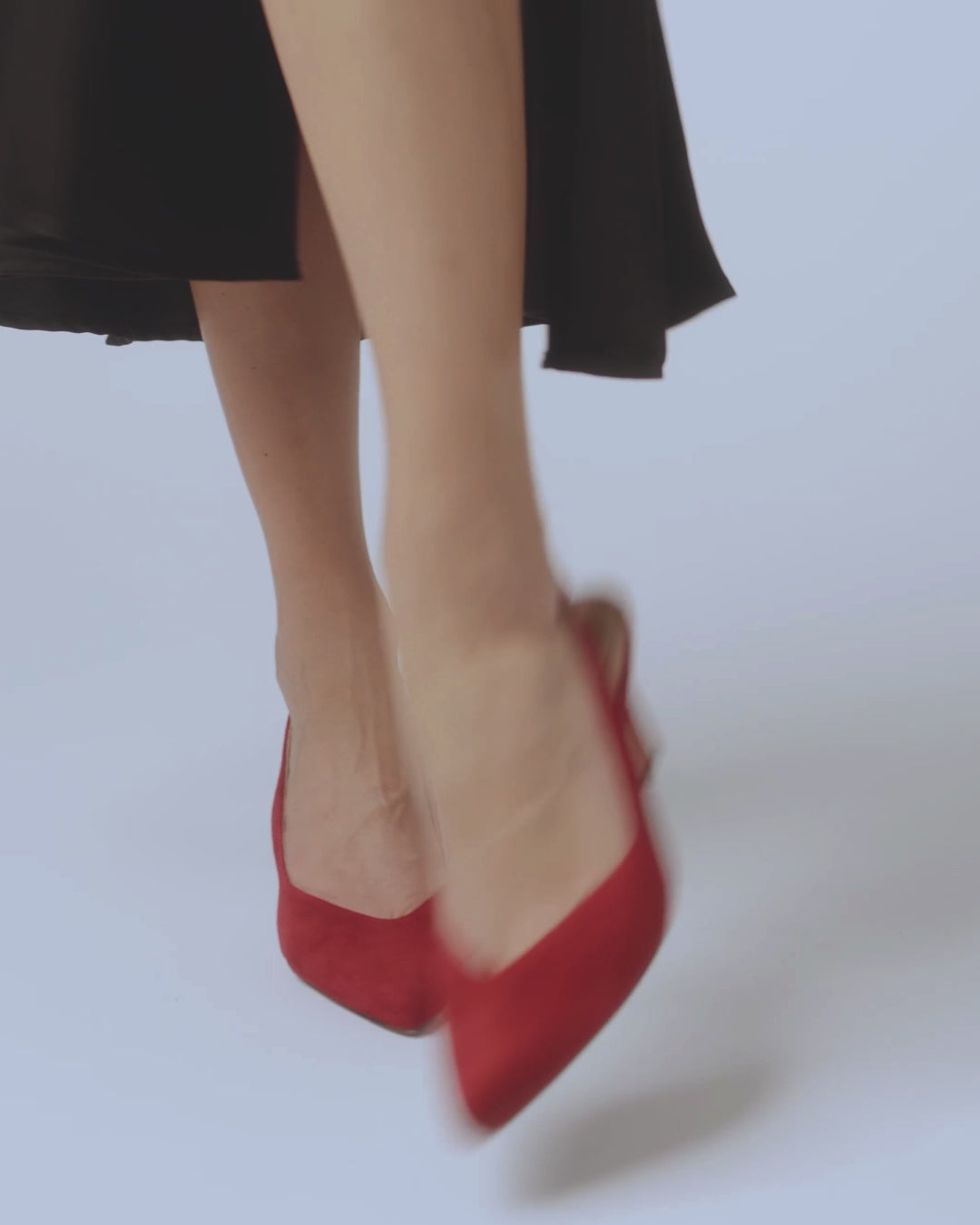 A mid‑heel slingback with a flattering V‑shape topline and classic pointed toe. A discreetly elasticized back strap provides an effortless, held‑on fit.