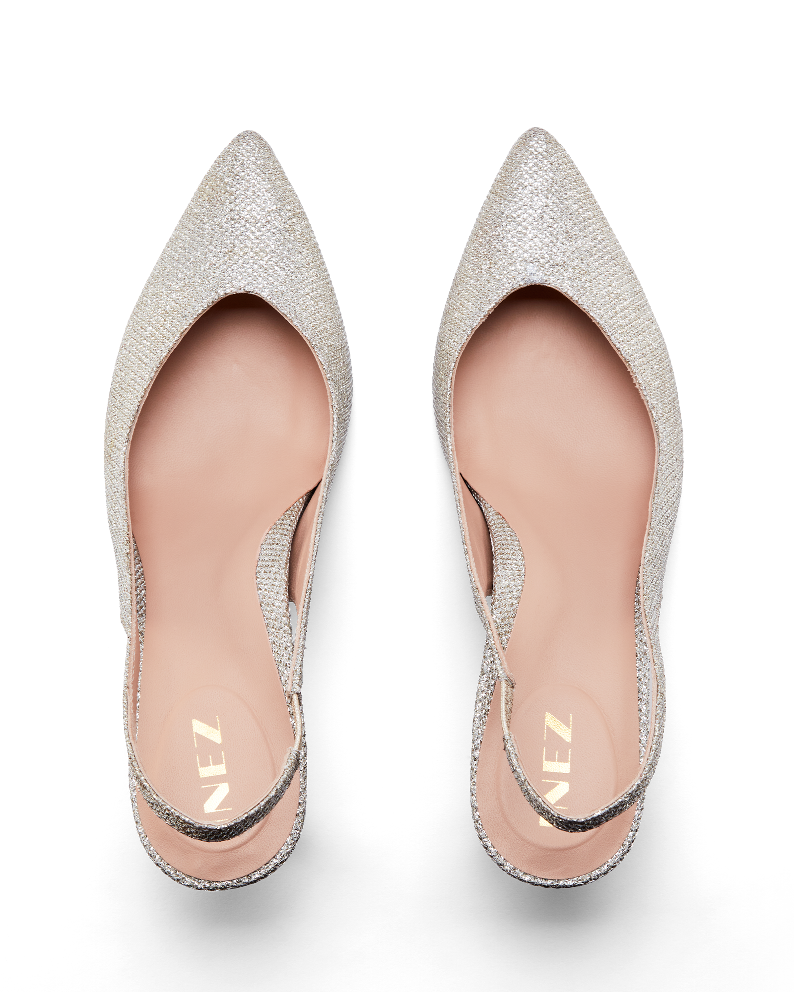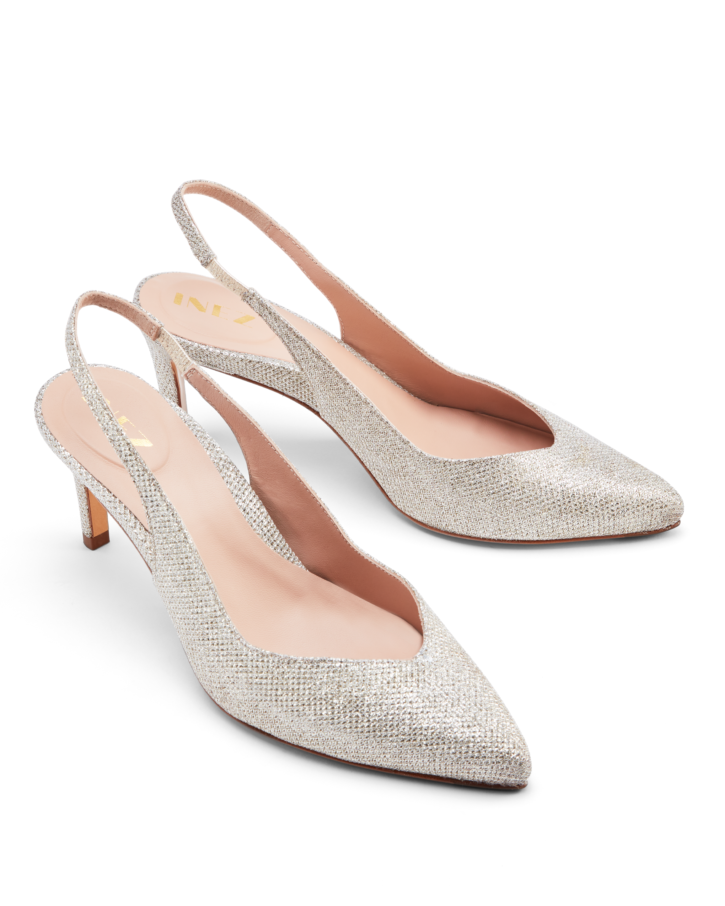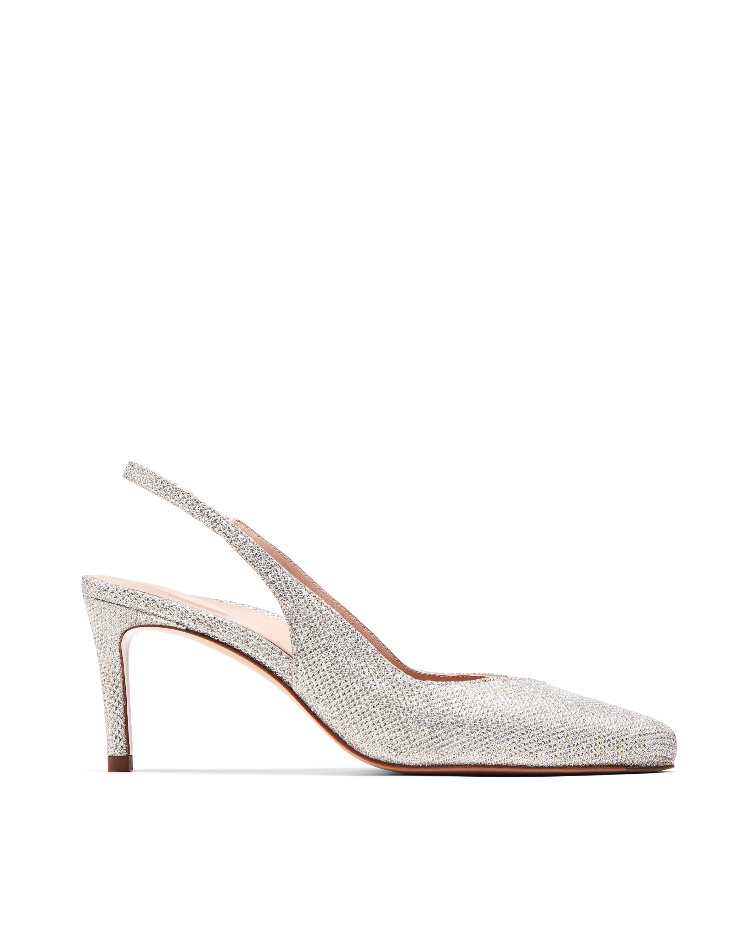 A mid‑heel slingback with a flattering V‑shape topline and classic pointed toe. A discreetly elasticized back strap provides an effortless, held‑on fit.