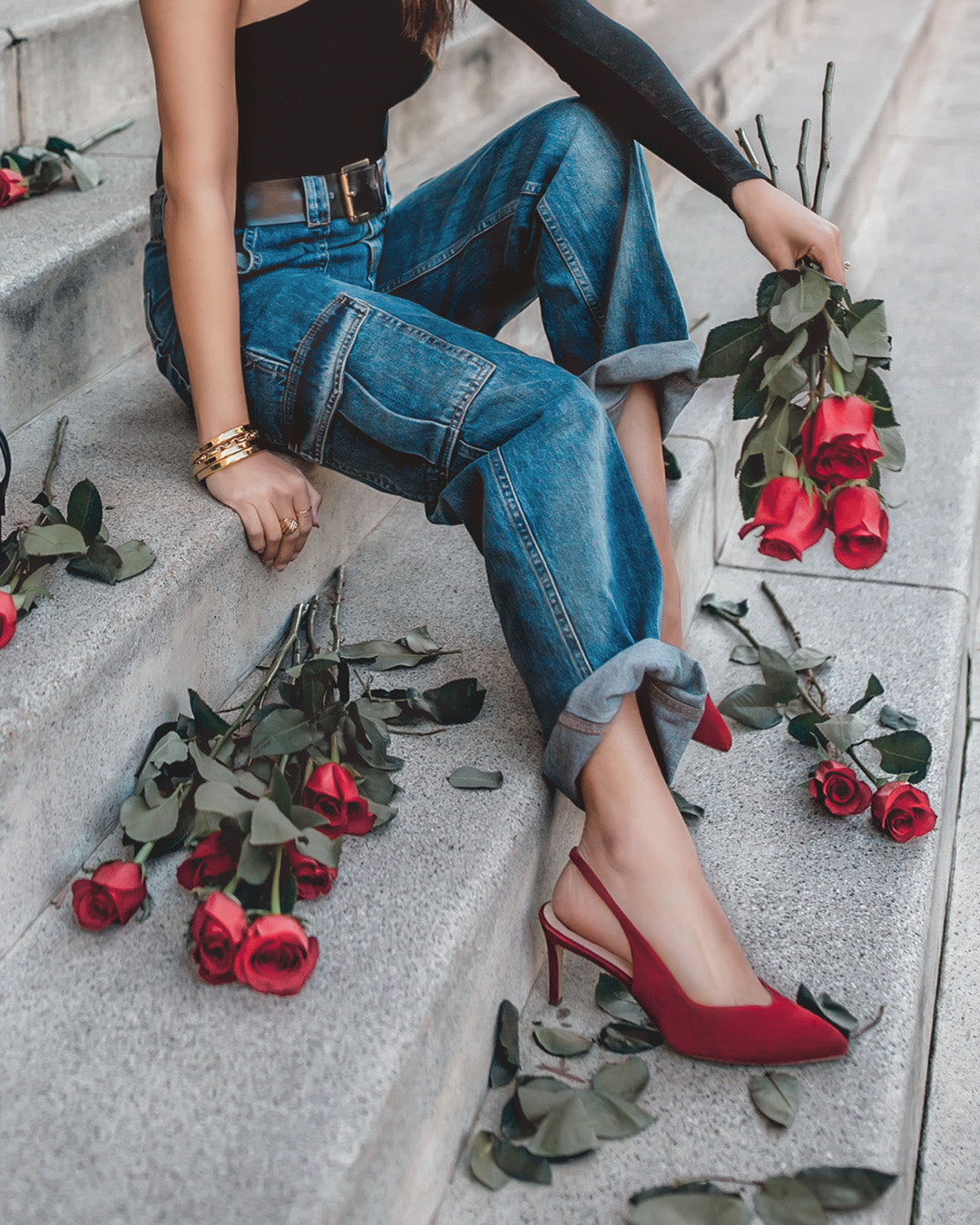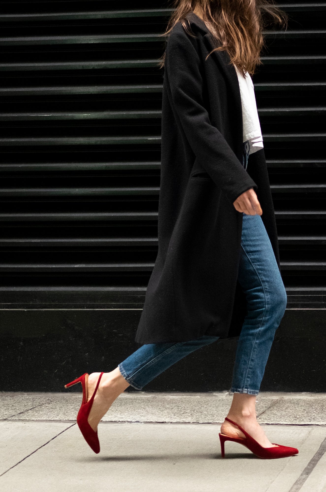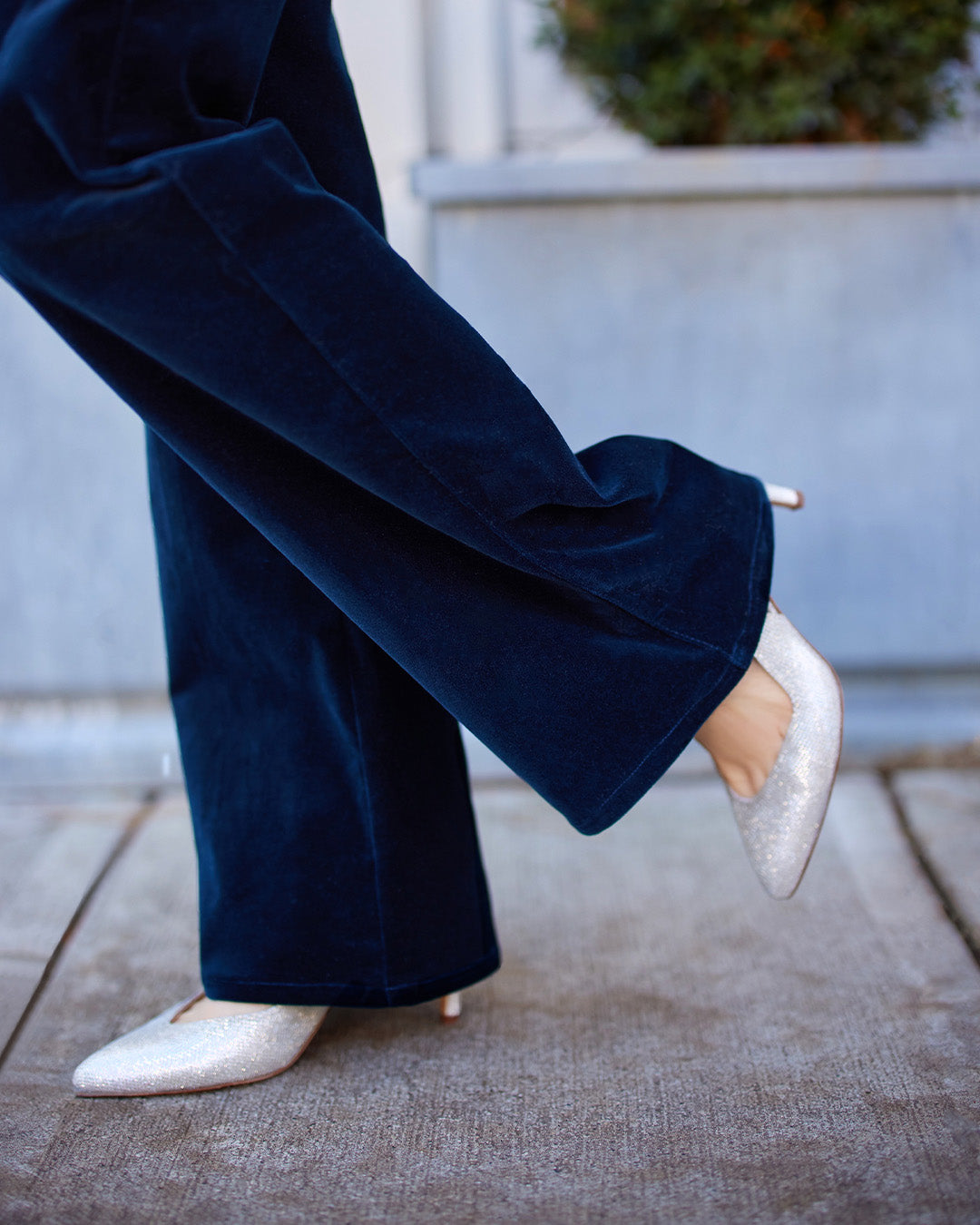 A mid‑heel slingback with a flattering V‑shape topline and classic pointed toe. A discreetly elasticized back strap provides an effortless, held‑on fit.