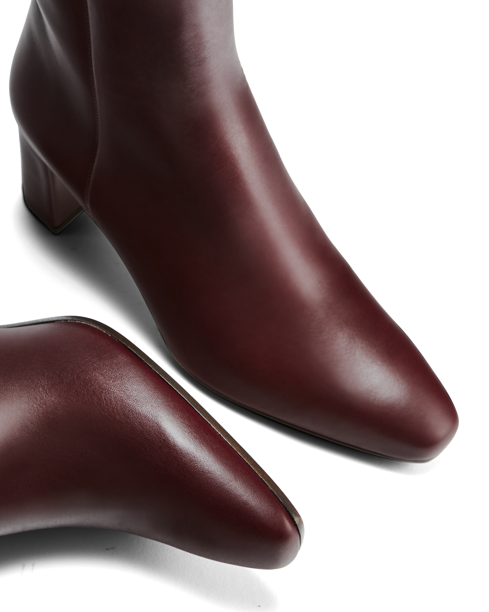 A mid‑heel bootie with a tapered, slim look. The "snip" toe provides a generous fit in the toe box, while a plush proprietary insole cushions your foot.