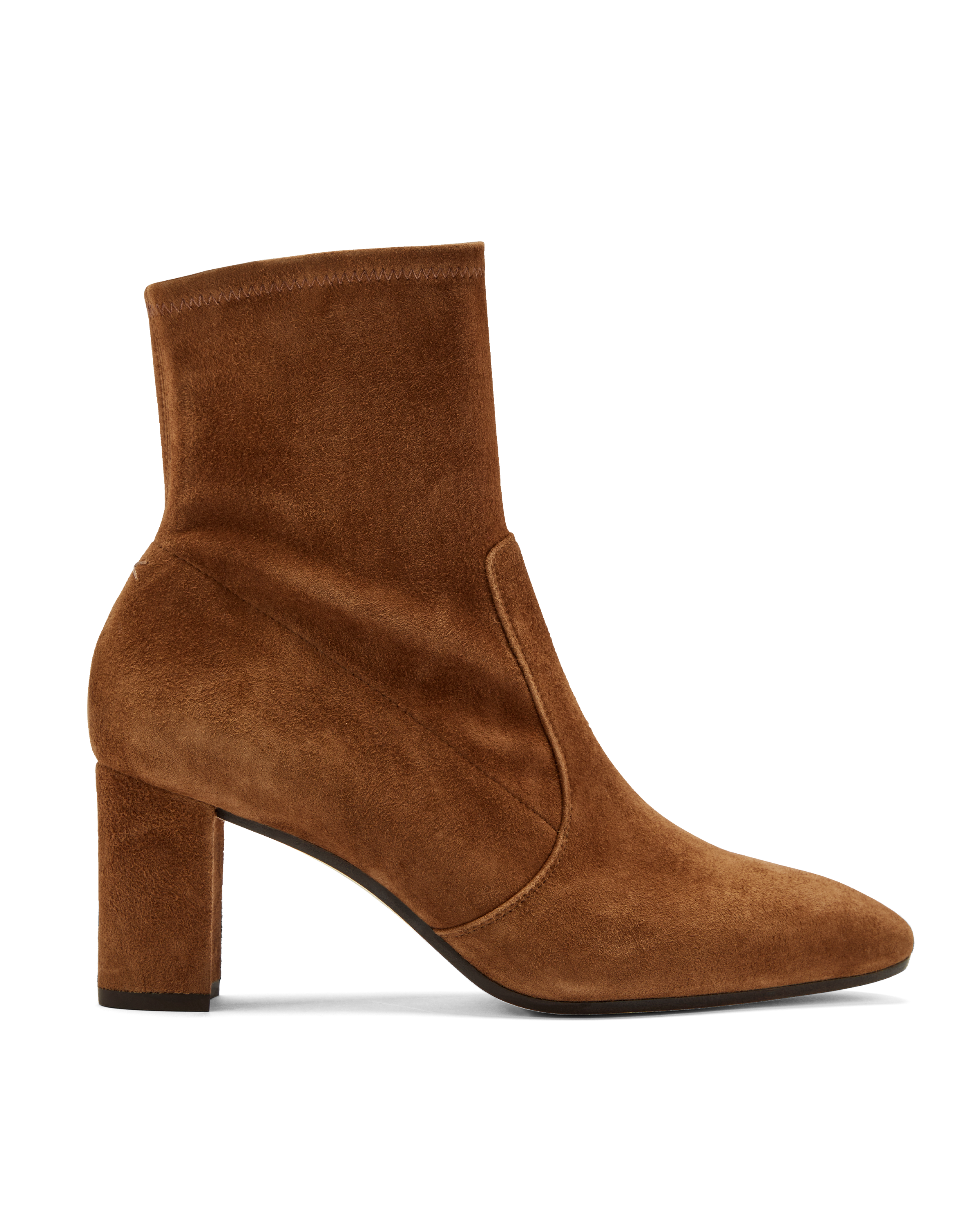 A mid‑heel bootie with a soft stretch suede upper that hugs the foot providing a tapered, slim look. The "snip" toe provides a generous fit in the toe box, while a plush proprietary insole cushions your foot.