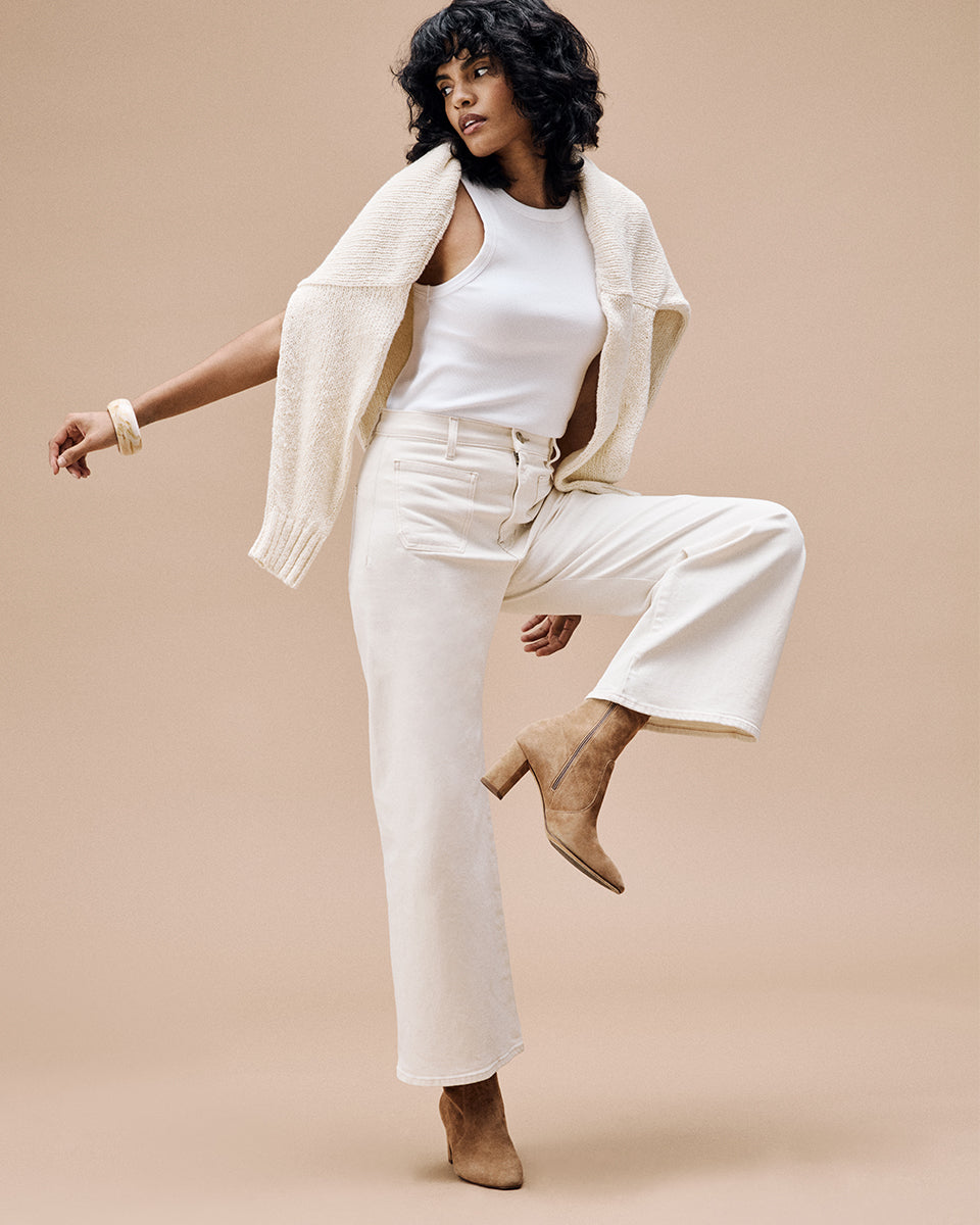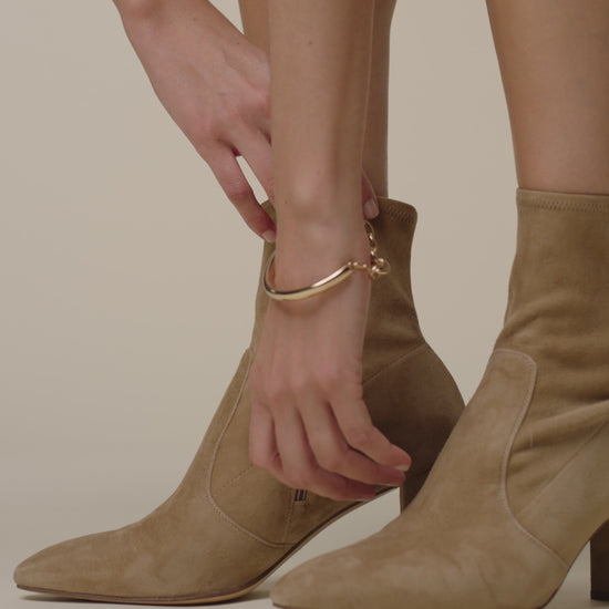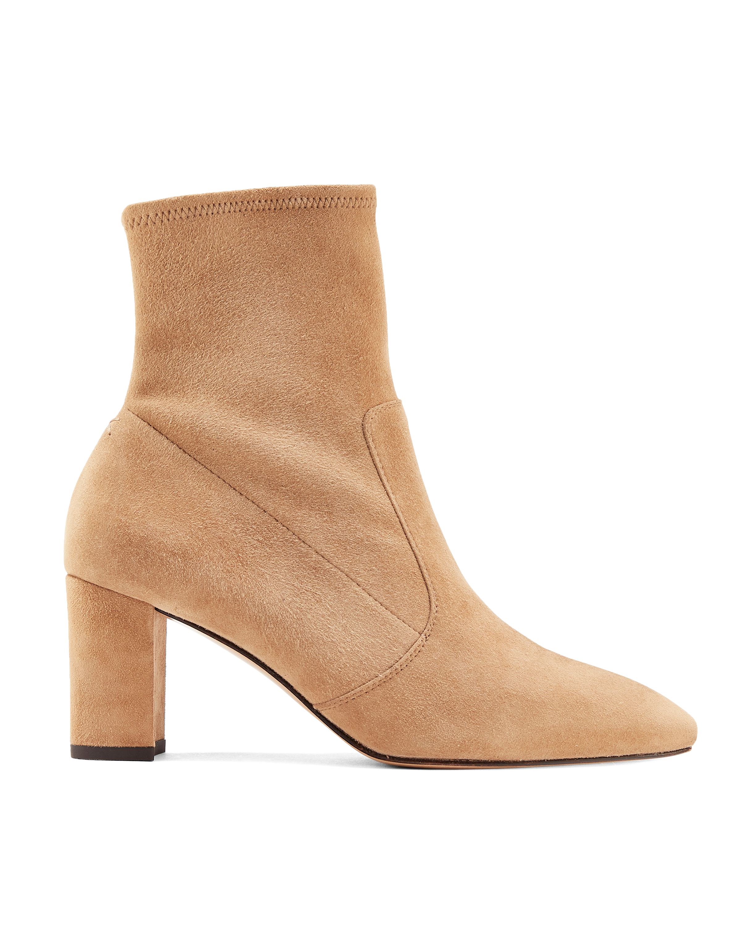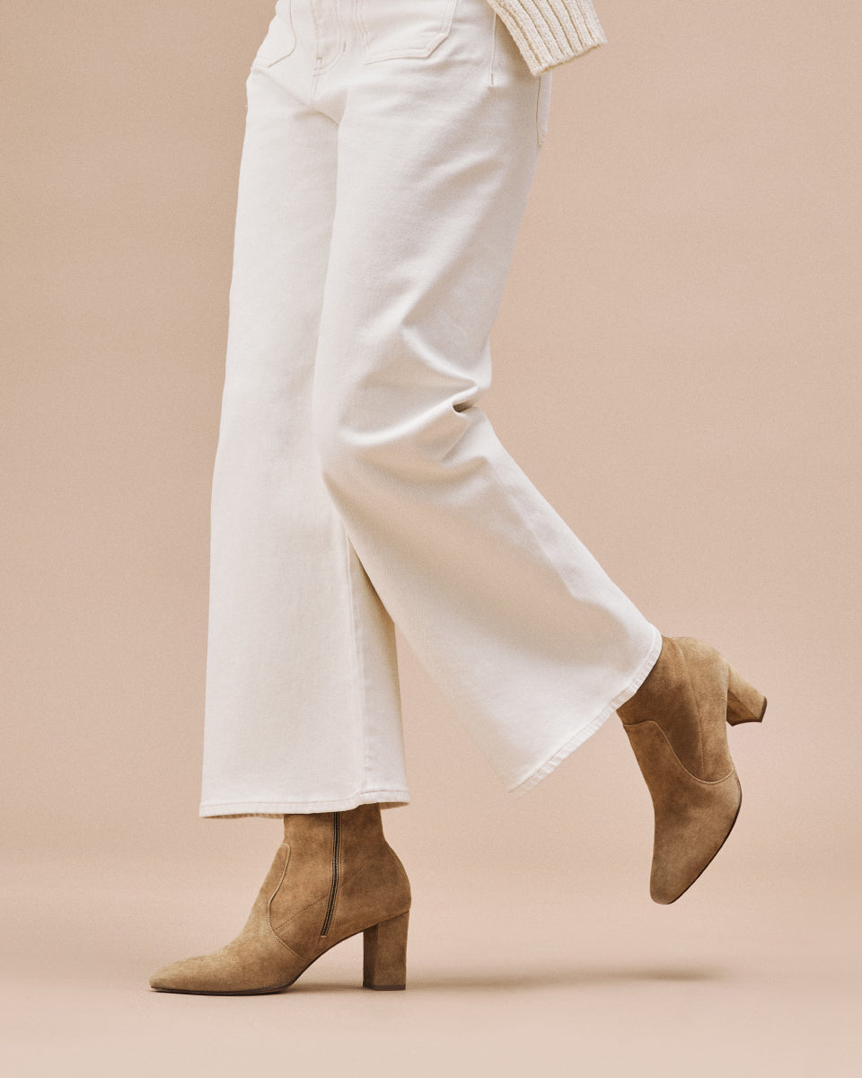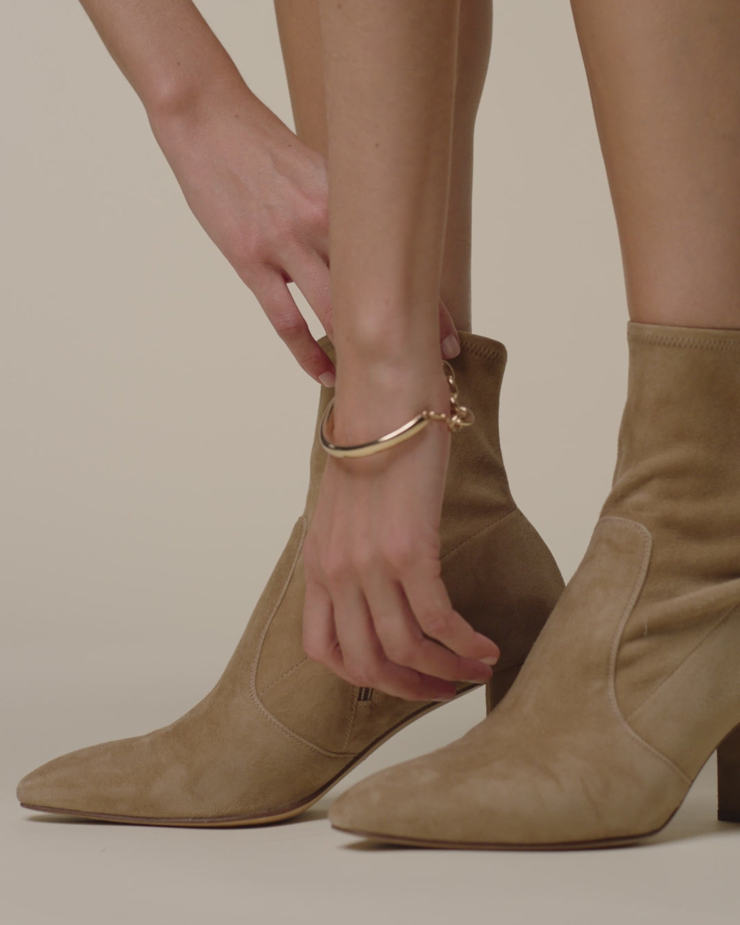 A mid‑heel bootie with a soft stretch suede upper that hugs the foot providing a tapered, slim look. The "snip" toe provides a generous fit in the toe box, while a plush proprietary insole cushions your foot.