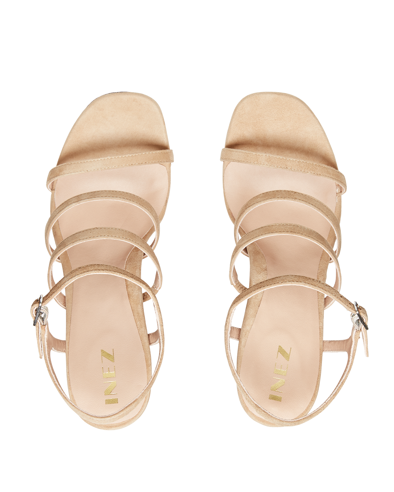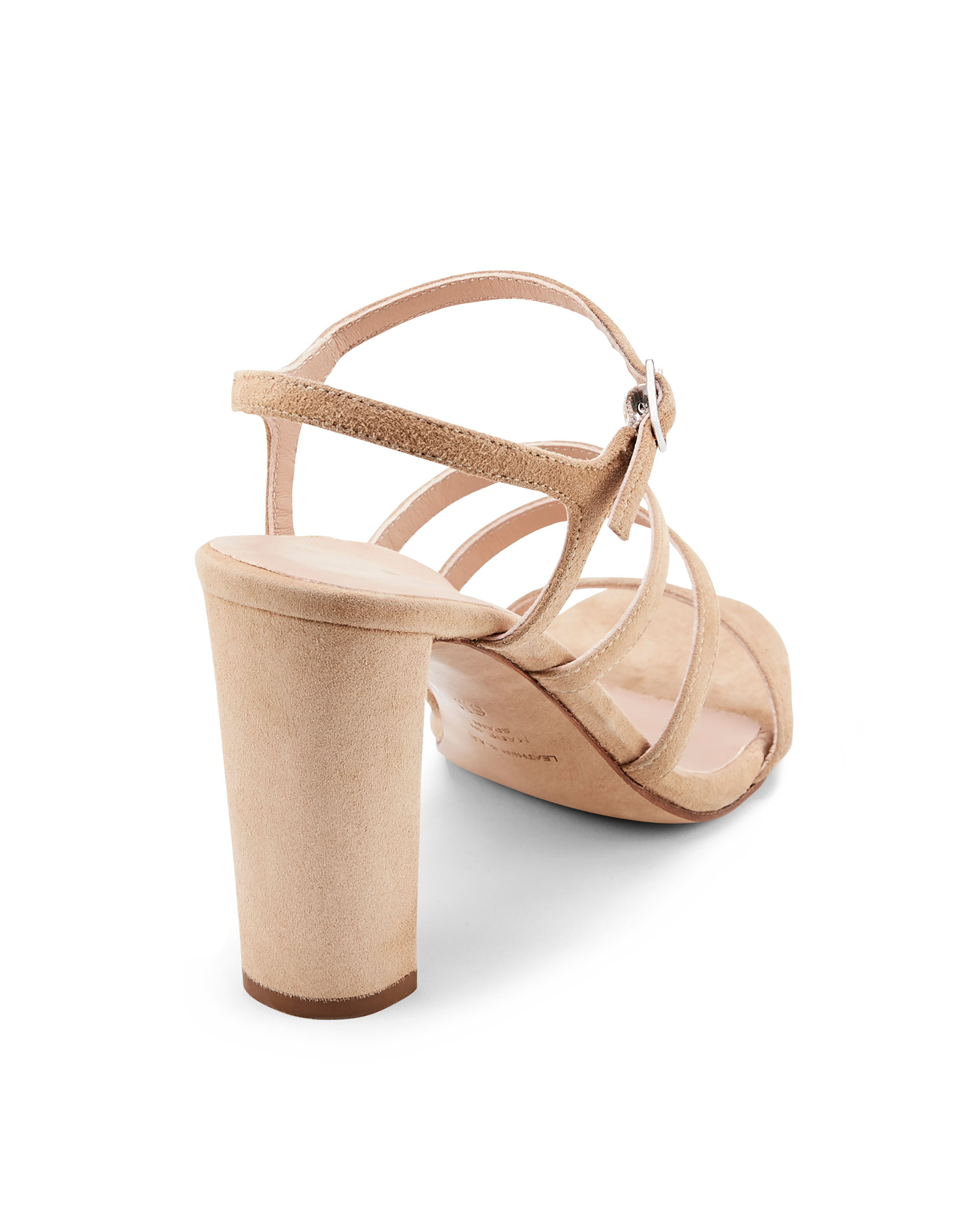 Thin, parallel straps on this high heel sandal are proportionately placed to secure the foot while providing a nearly‑nude look on top of a custom‑designed insole.