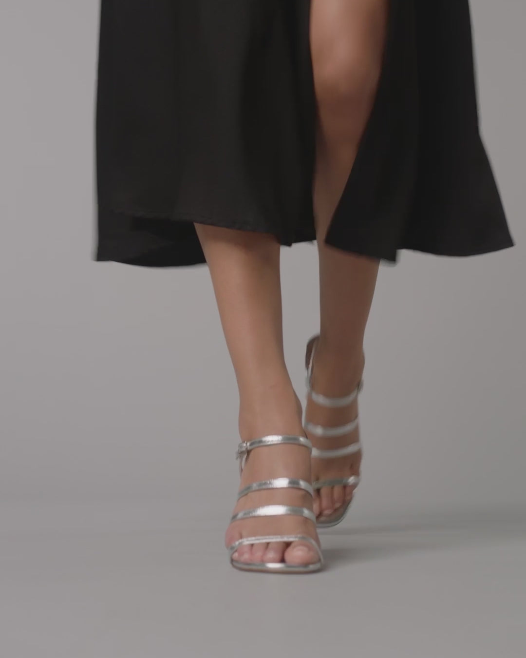 Thin, parallel straps on this high heel sandal are proportionately placed to secure the foot while providing a nearly‑nude look on top of a custom‑designed insole.