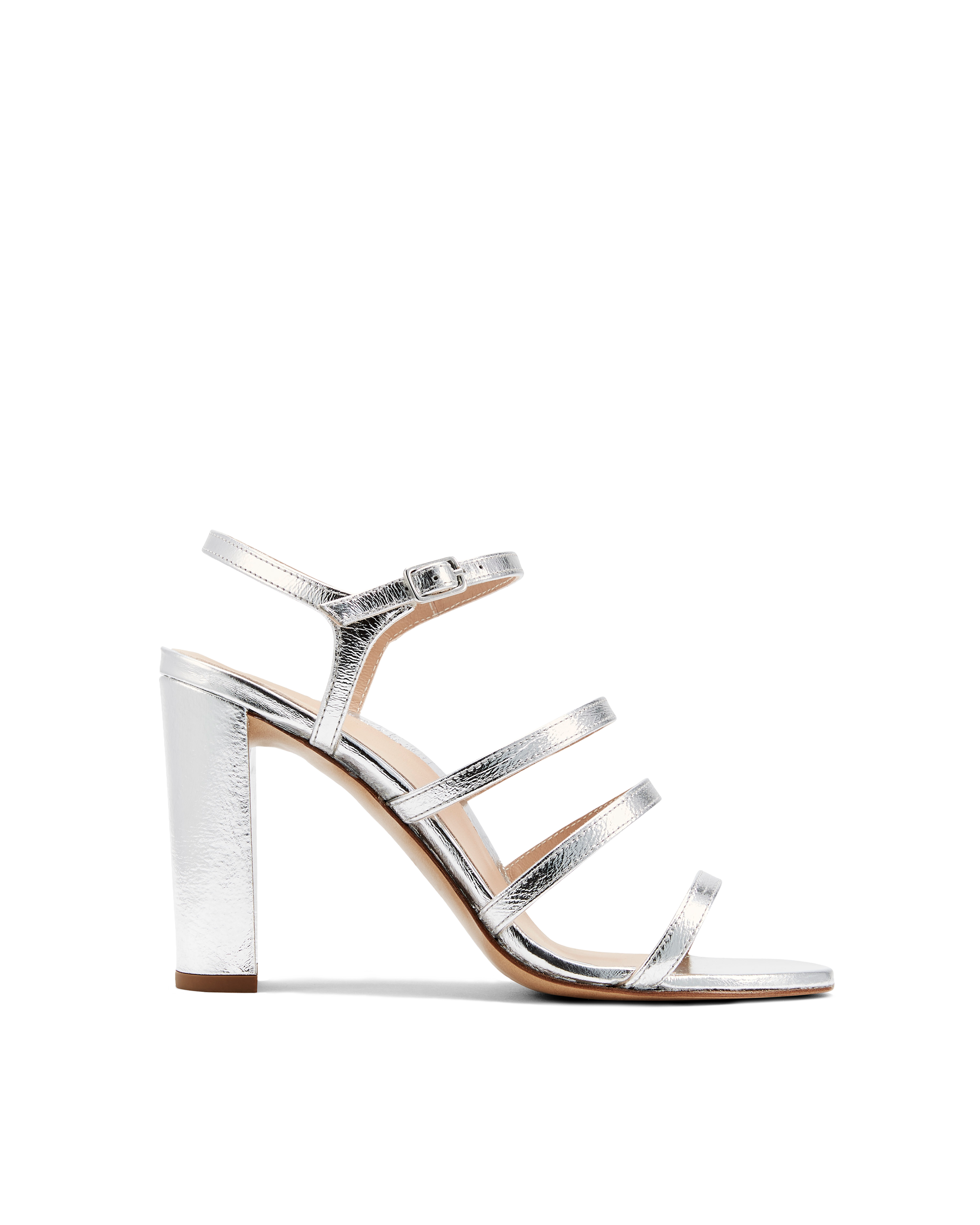 Thin, parallel straps on this high heel sandal are proportionately placed to secure the foot while providing a nearly‑nude look on top of a custom‑designed insole.